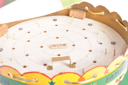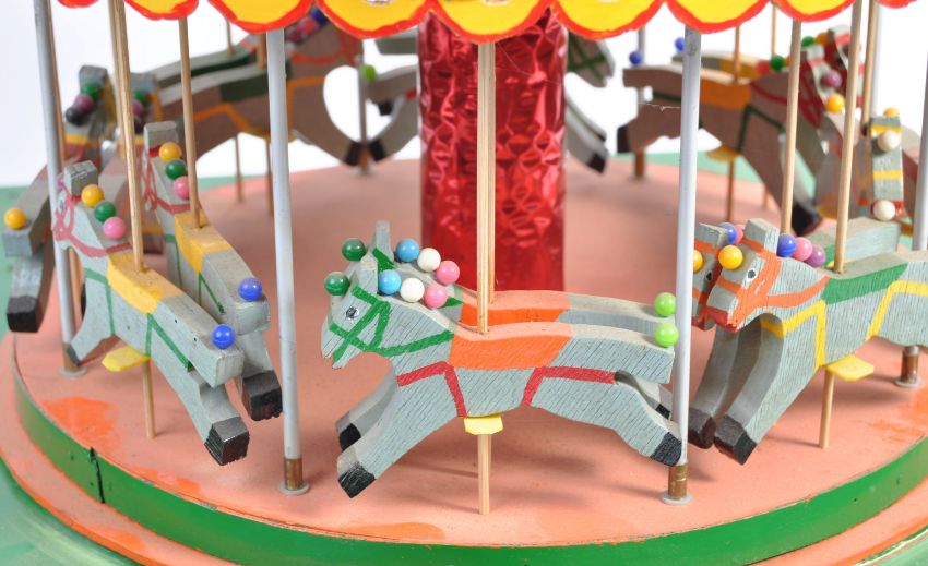 A charming vintage scratch-built model of a fairground / circus Carousel / Golden Gallopers ride. Wooden construction, with removable top section. The centre fitted with carved wooden horses and the base appearing to be a vintage record player. Some electrical components fitted, but untested. Measures approx; 46cm tall.
