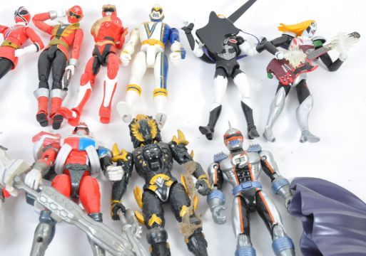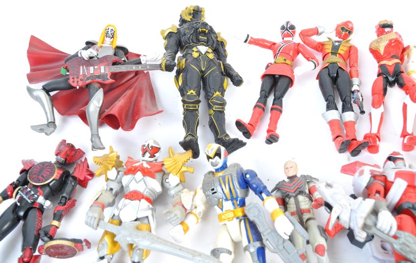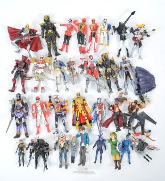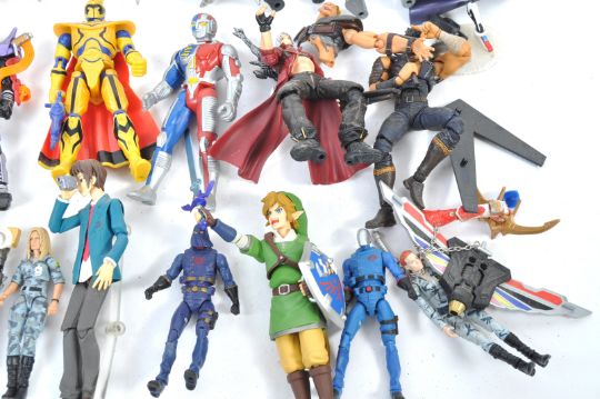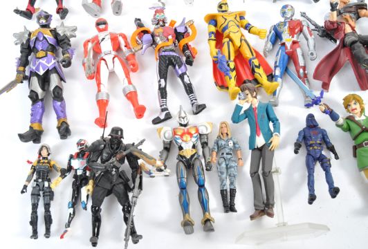 A large collection of 30+ assorted mostly Japanese Anime action figures to include SH Figuarts, Figma, Bandia examples comprising Zelda, Power Rangers, Kamen Rider, Konami and many more unknown examples. Great collection.