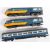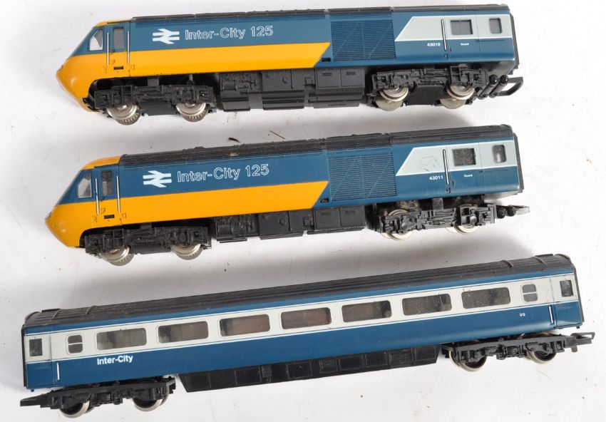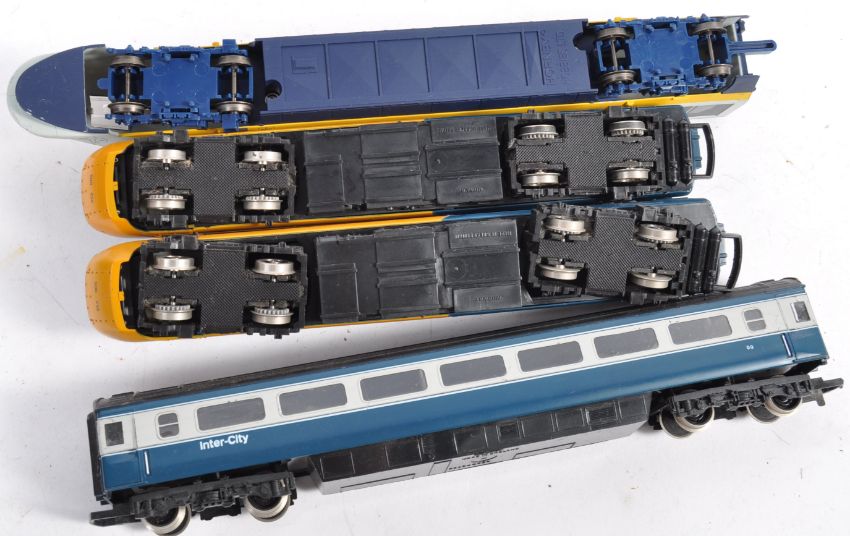 Two Hornby made 00 gauge model railway train set diesel locomotives comprising: Inter-City 125 43010 loco,  43011 dummy and R439 carriage / coach along with a Eurostar 3214 dummy loco and pair of matching carriages.