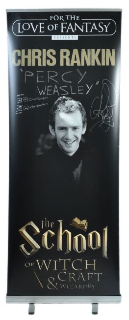 Chris Rankin -  Percy Weasley in the Harry Potter movies etc - autographed Monopoly Events banner from a ' For The Love Of Fantasy ' event. The banner depicting Rankin to the centre. Signed in silver ink to a dark area of the banner. Fabulous display piece.