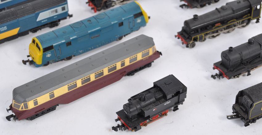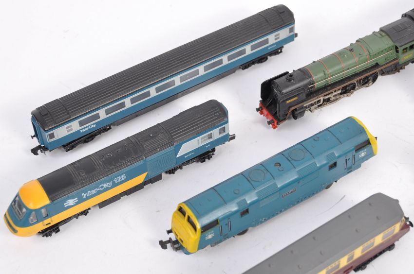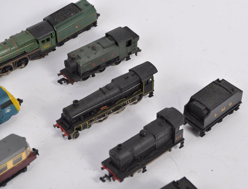 A collection of 8x N gauge / Narrow gauge model railway train set locomotive engines comprising a Graham Farish Grafar Intercity 125 with coach, Trix Eclipse D816, Grafar W27W, Trix 47160, Lima 4537 LMS tender drives loco, Peco LMS Tender driven loco and Trix Britannia 70000 loco and tender. All appear in good condition.