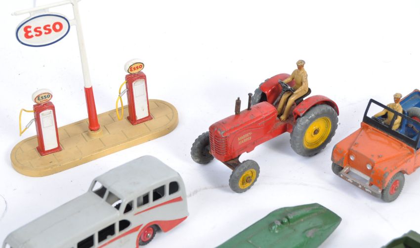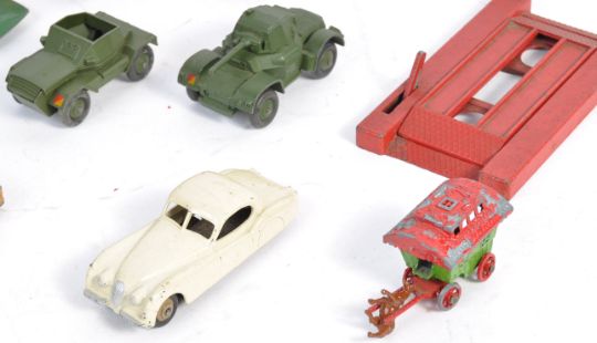 A collection of 14x original vintage Dinky Toys made diecast models comprising 157 Jaguar, 190 Caravan Observation Coach, MG Record Car, Rover 75, Massey Harris Tractor, Land Rover, 673 Scout Car, Ford Sedan 670 Armoured Car, Sack Trucks, 781 Esso Pump set, Telephone Box, Police Box along with a Crescent car ramp and another Made In England horse drawn carriage. Models in good - very near mint condition. Great collection.