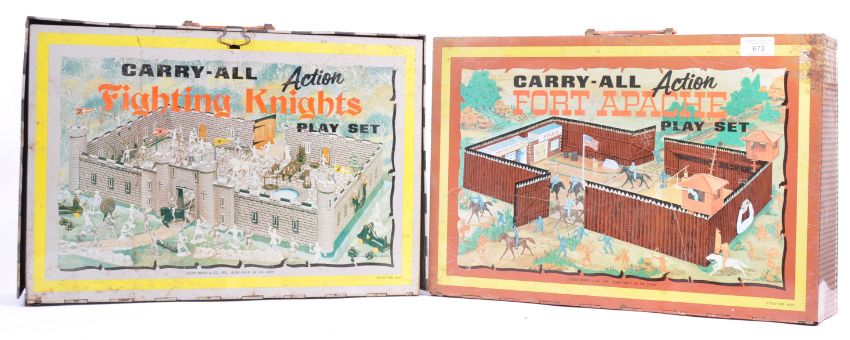 Two rare original Lous Marx / Marx Toys made ' Carry All ' plastic / lead soldier tinplate carry cases. Comprising ' Fort Apache ' and ' Fighting Knights ' sets. Both cases of litho-printed tin construction, and both with some contents present. Fabulous display pieces. Rare.