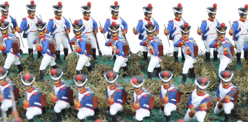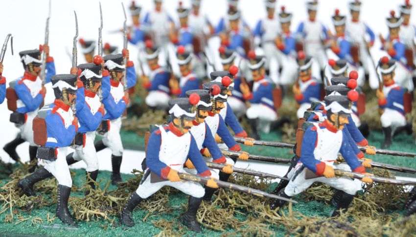 An impressive collection of 1/32 scale Napoleonic War plastic figures - ' French Infantry ' - comprising of x94 pro-painted highly detailed model figures mounted on dioramic base plates. x4 groups in total. Make unknown but probably Drum and Flag, Airfix or similar. An impressive museum quality collection.