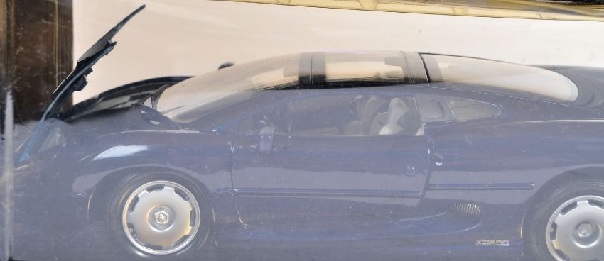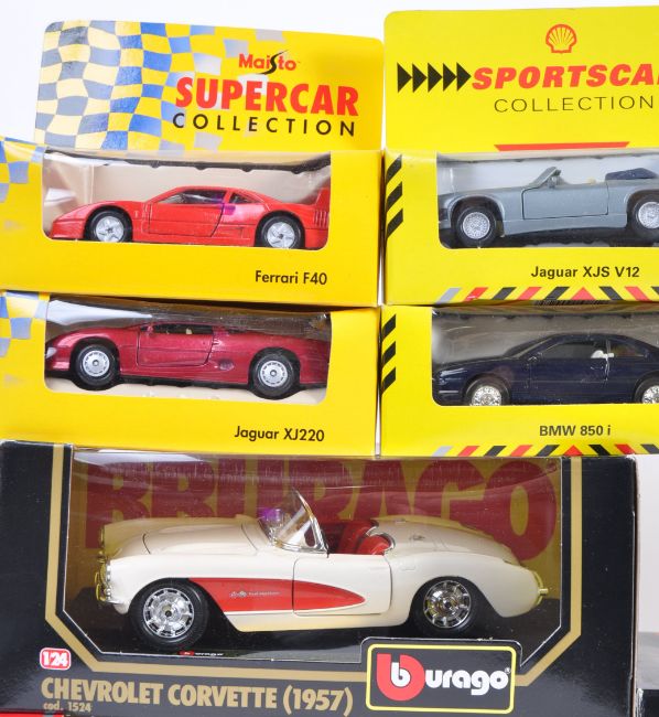 A collection of assorted scale diecast models comprising a Bburago / Burago 1/24 scale 1957 Chevrolet Corvette, Burago 1/24 Ford AC Cobra 427 1965, Maisto 1/18 Jaguar XJ220, Majorette 1/24 Mercedes 500 SL Roadster along with many Maisto Supercars collection diecast models. All appear mint within original boxes.