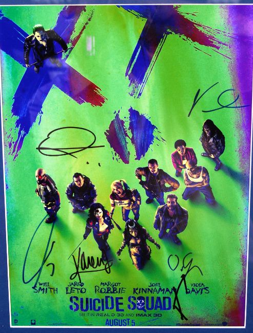 Suicide Squad - DC Comics - An incredibly rare original autograph presentation from the 2016 DC Comics film ' Suicide Squad '. Featuring the autographs of the entire main cast - Margot Robbie, Will Smith, Jared Leto, Joel Kinnaman, Adewale Akinnuoye-Agbaje, Jai Courtney, Karen Fukuhara and David Ayer. Comprising of a signed central poster, and x2 8x10" colour photographs. All professionally framed and glazed to a total size of 58cm x 83cm. All obtained in-person by an AFTAL registered dealer, with certificate.