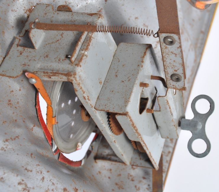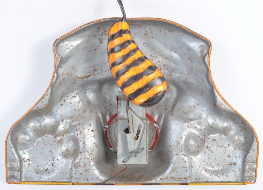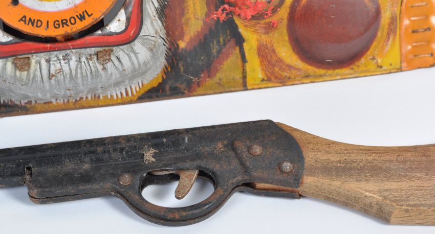 A rare vintage c1950's tinplate ' Shoot Me And I Growl ' target shooting clockwork game. The game of litho-printed tinplate construction, with clockwork mechanism that makes noise and moves the tail once hit. No makers marks. Along with a period wooden and steel cork gun. Rare playset.