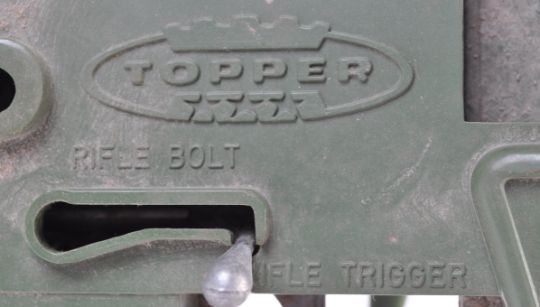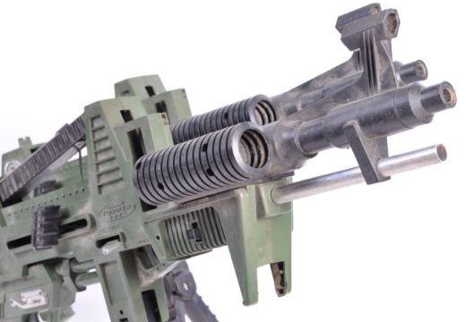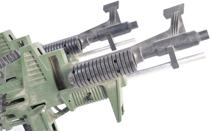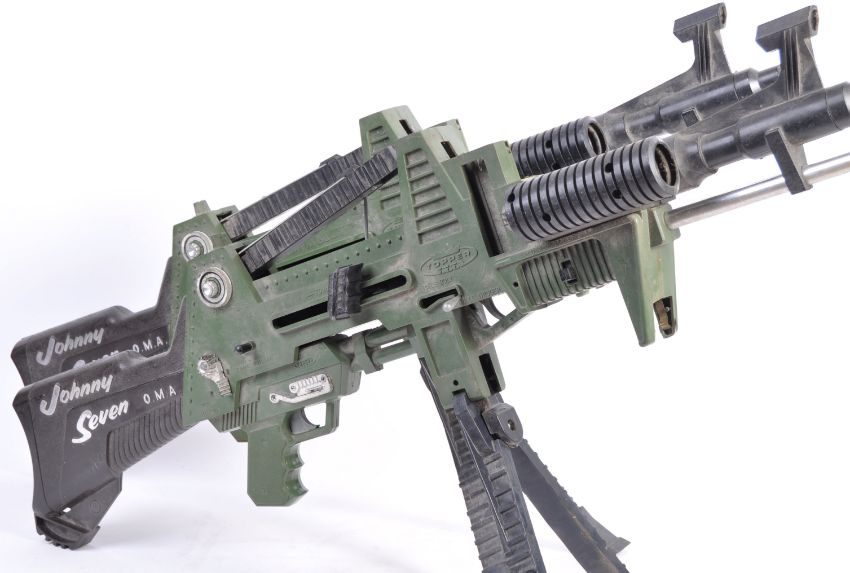Two rare original vintage Tri-ang / Triang made ' Johnny Seven - One Man Army ' plastic toy machine guns. Both unboxed, and in various conditions. Green plastic construction, with various levers, buttons and mechanisms present. Both supplied with a quantity of projectiles. Unboxed. Rare playsets.