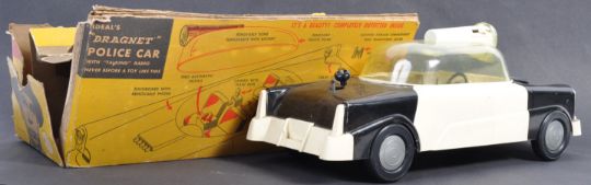 A rare original vintage Ideal made ' Dragnet - Talking Police Car ' playset. The car of plastic construction with clear section to top, winding handle to rear and detailed interior. Within its original cardboard box (tatty). A rare playset.