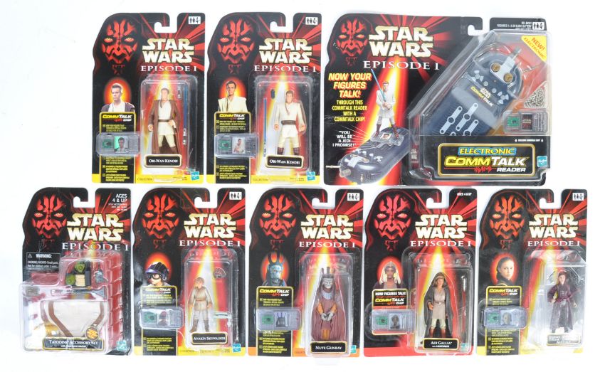 Star Wars - a collection of x8 Hasbro made Star Wars Episode I carded action figures. All factory sealed, mint and as new, to include; Obi Wan Kenobi, Nute Gunray, Adi Gallia, Amidala and a Commtalk Reader. All as new.