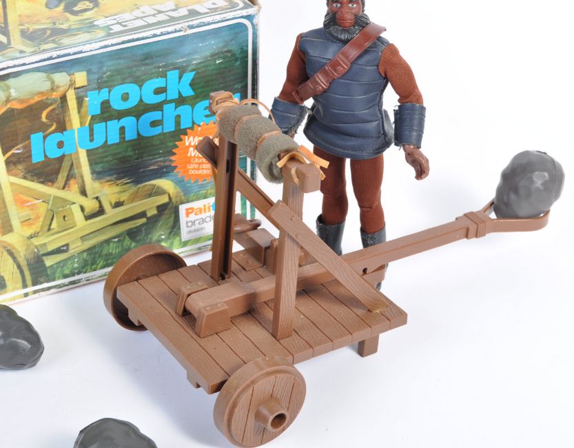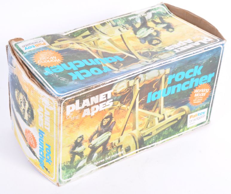 A rare original vintage Palitoy made Planet Of The Apes action figure playset ' Rock Launcher '. Comprising of launcher and two rocks, with an original Planet Of The Apes action figure. Within the original box (faded). Rare playset.