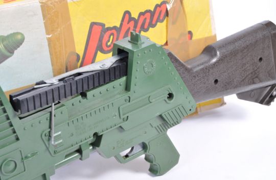 A rare original vintage Tri-ang / Triang made ' Johnny Seven - One Man Army ' machine gun ' Seven Guns In One ' playset. The gun with a grenade, red rocket and some small projectiles present. Within its original box (tatty). Rare playset.
