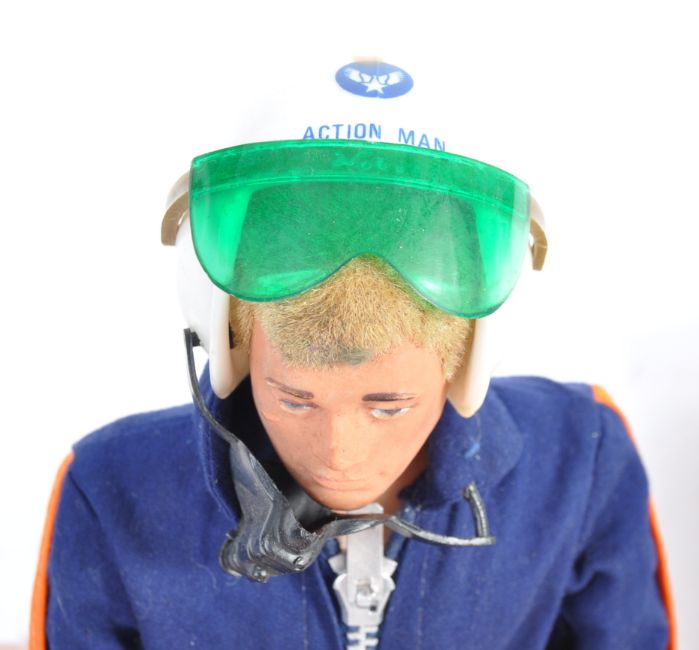 An original vintage 1970's (1975) Palitoy made Action Man ' Helicopter Pilot ' action figure. With uniform - comprising: boots, flight suit, helmet with face mask and goggles. Includes Turbo-Copter MK1XA. Head loose. Rare