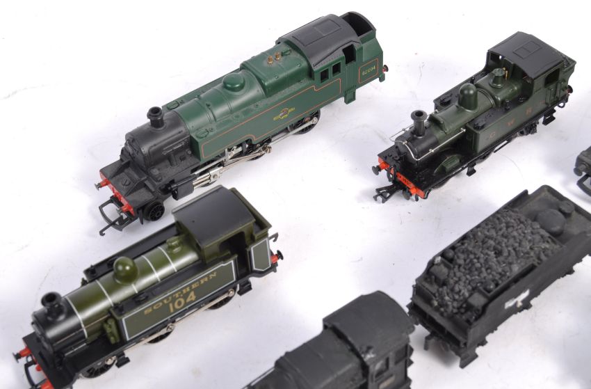 A collection of 10x assorted 00 gauge model railway train set locomotives comprising: Hornby MR 11, LMS OF 16031, Hornby Lynne & Co Collieries, GWR 8751, Southern 104, Triang 82004, r59, R52, Airfix GWR 1466,. Mainline 7327. Most in working order. Great collection.
