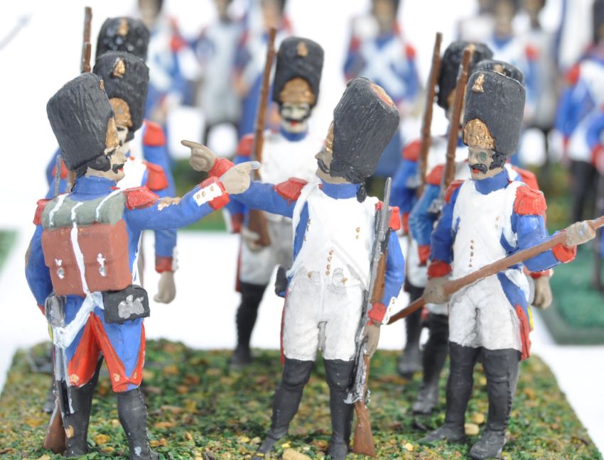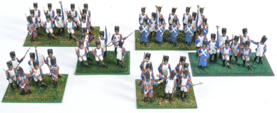 An impressive collection of 1/32 scale Napoleonic War plastic figures -  ' French Imperial Guard ' - comprising of x54 pro-painted highly detailed model figures mounted on dioramic base plates. x6 groups in total. Make unknown but probably Drum and Flag, Airfix or similar. An impressive museum quality collection.