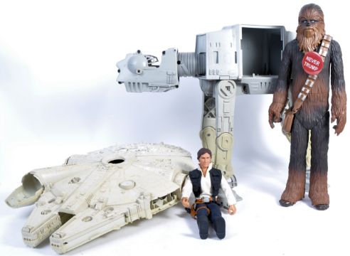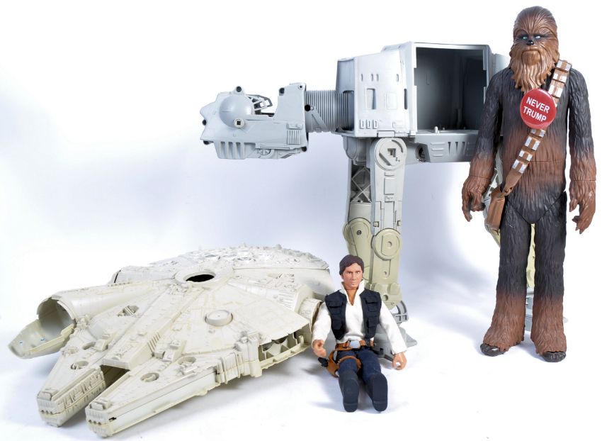 A collection of assorted Star Wars toys to include; a vintage Kenner Millennium Falcon playset (incomplete), a vintage AT-AT playset (incomplete, but retaining battery cover), a Hasbro 12" Han Solo action figure with blaster, and a larger scale Jakks Pacific Chewbacca (with an original Donald Trump rally badge) to front. Interesting collection.
