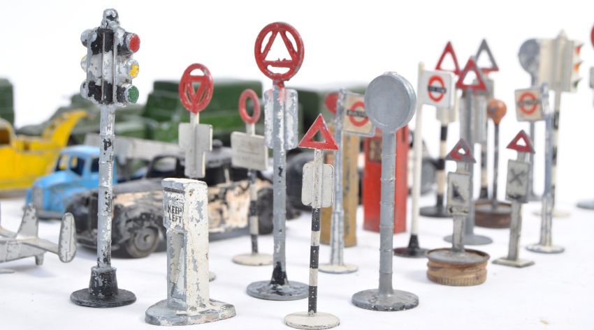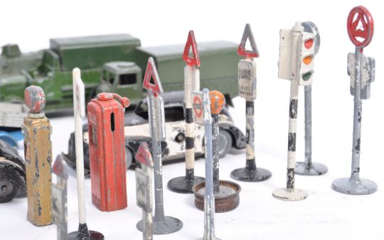 A collection of early diecast Dinky Toys made diecast models and road signs (and some others). Comprising of Dinky Military models including Armoured Command Vehicle, Armoured Personnel Carrier, an Aveling Varford Roller, a Dodge pick up and clockwork police car. A variety of twenty one road signs ranging from traffic lights, bus stops and petrol tanks.