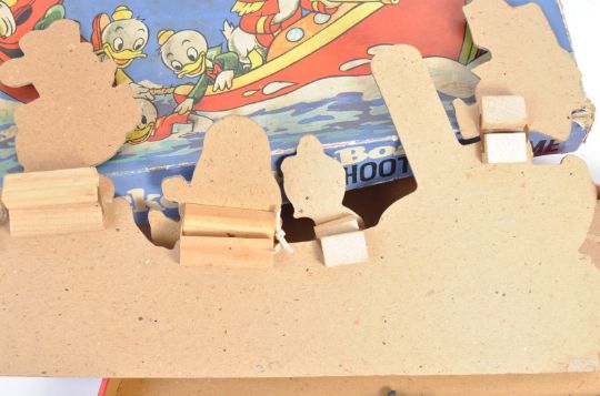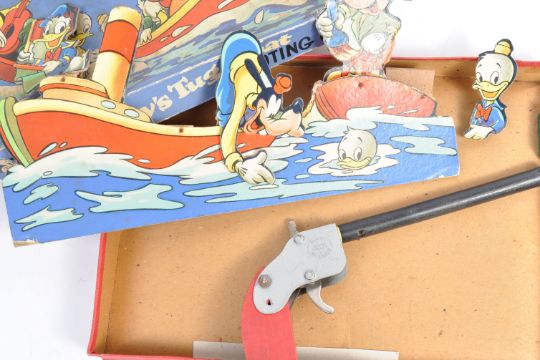 A rare original 1950's Chad Valley made Walt Disney ' Mickey's Tug-boat Shooting Game '. Appears complete with all four characters, the original stand blocks still within the box, and the rare original Chad Valley ' Bandit ' rubber band gun. Within the original box. Scarce game.