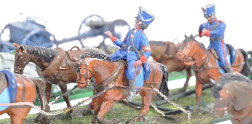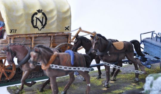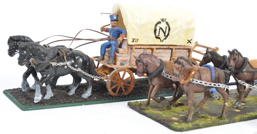 An impressive collection of 1/32 scale Napoleonic War plastic figures - ' French Horse Artillery ' and ' French Horse Wagons ' comprising of x18 horses, 5 model soldiers, x2 baggage and artillery wagons and 2x battlefield accessory walls. Pro-painted, highly detailed model figures mounted on dioramic base plates. x4 groups in total. Make unknown but probably Drum and Flag, Airfix or similar. An impressive museum quality collection.