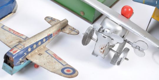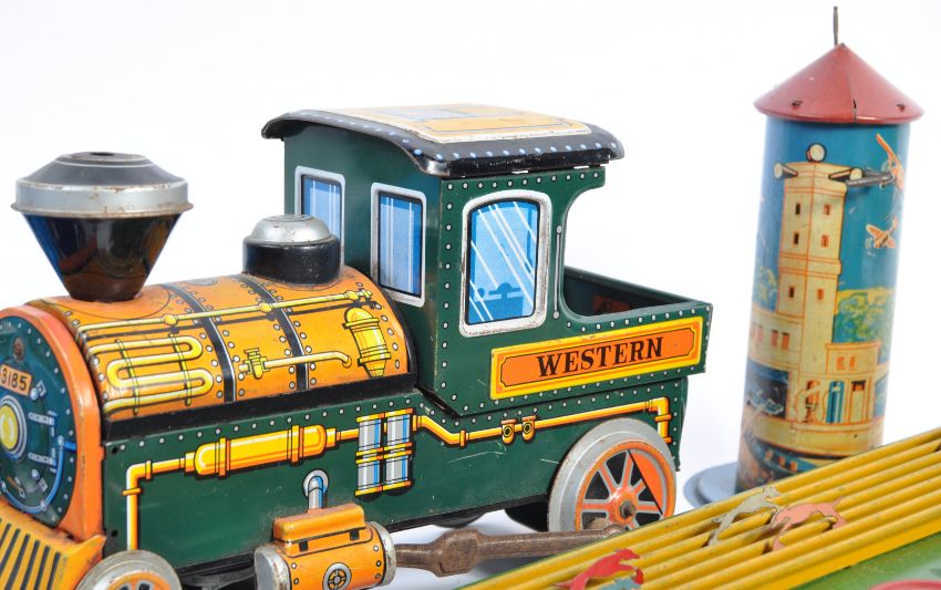 An interesting collection of assorted vintage tinplate (some battery operated) toys. To include; a Gee-Wiz tinplate horse racing game, an ST-I friction powered Concorde type jet liner toy, a battery operated ' Western ' locomotive, a 1970's tinplate Volkswagen Beetle toy (battery operated), an aeronautical set with aeroplanes and other items. Interesting collection.