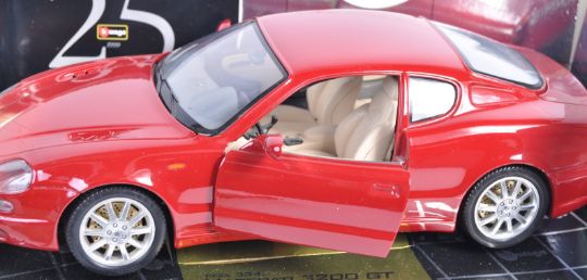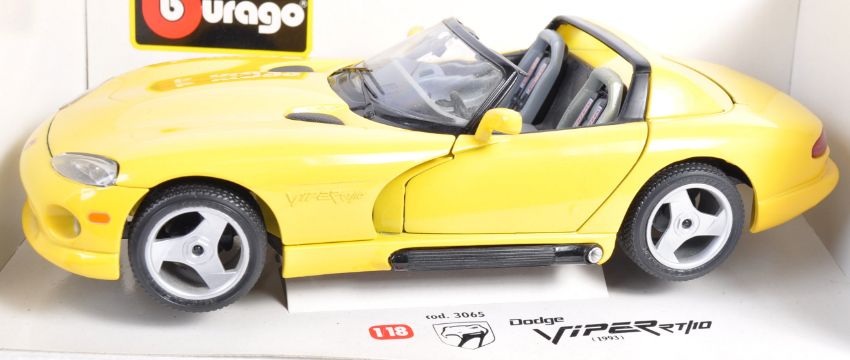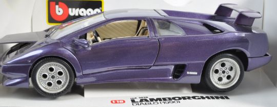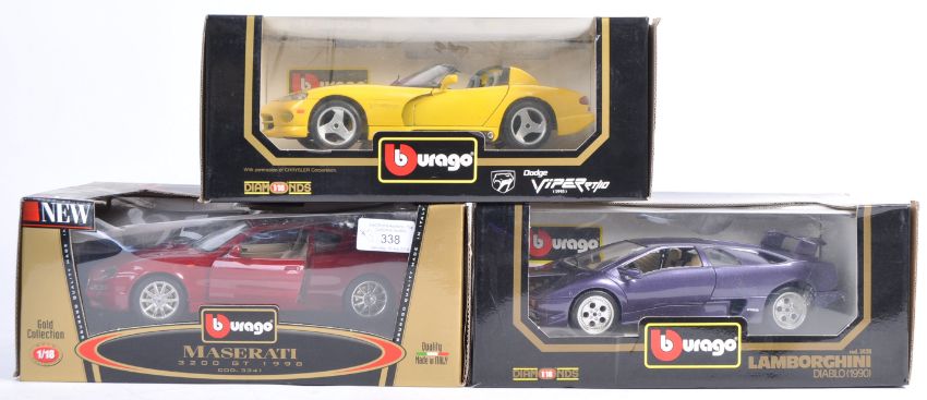 A collection of x3 Burago made 1/8 precision diecast model cars comprising of Viper Dodge RT/10 model No - 3065 (1993) , Lamborghini Diablo model No - 3028 (1990) and Maserati 3200 GT model No 3341 (1998). All appear complete and within original boxes.