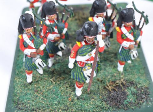 An impressive collection of 1/32 scale Napoleonic War plastic figures - ' British Infantry ' and ' Band of the Scots Guards' - comprising of x30 pro-painted highly detailed model figures mounted on dioramic base plates. x3 groups in total. Make unknown but probably Drum and Flag, Airfix or similar. An impressive museum quality collection.