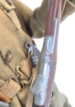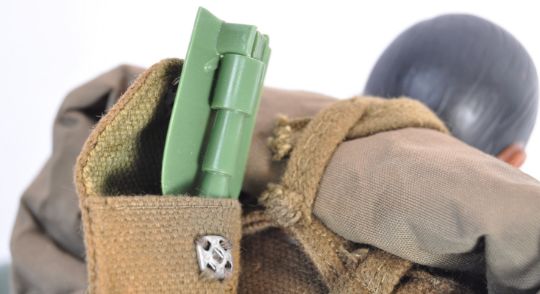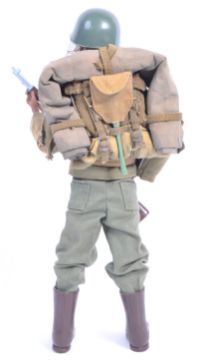 An original vintage 1970's Palitoy made Action Man ' US Soldier ' action figure outfit / uniform comprising - helmet (with camo net), dress tunic, belt with accessories, trousers, boots, rifle and haversack (with accessories). The outfit dressed on a re-issue Action Man / GI Joe black figure. Wonderful display piece.
