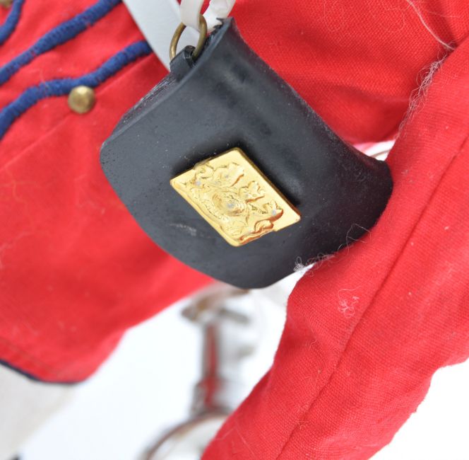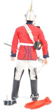 An original vintage 1970's (1971) Palitoy made Action Man ' The Life Guards ' action figure. With uniform - comprising: helmet with red plume, red jacket, sash pouch, trousers, boots, spurs, and sword. Figure an early black flocked hair variation. Rare