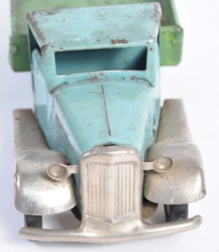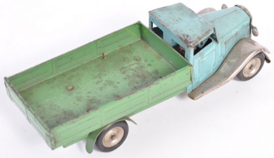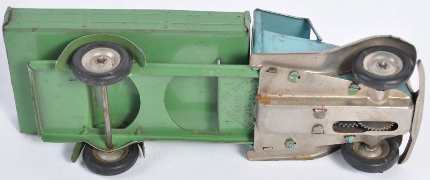 A rare original vintage Triang / Tri-ang Minic Toys made tinplate clockwork open wagon. Two tone blue and green, the bed in green with a lighter blue cab. All four original wheels and tyres present. No key, but working order (a little temperamental). Charming vintage toy.