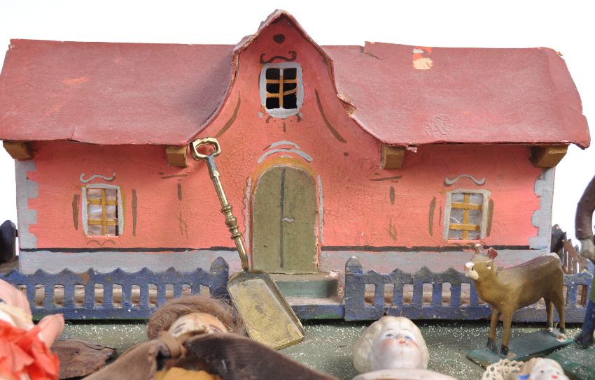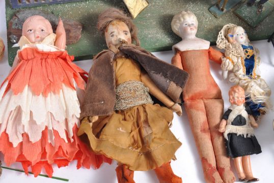A collection of antique and vintage dolls house figures / doll's and accessories to include; an antique German model of a cottage, several bisque headed dolls, wooden furniture and other accessories;