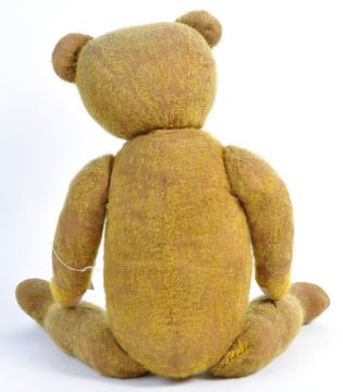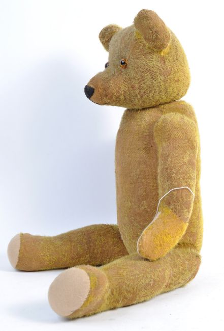 A large c1930's mid-century teddy bear of unknown origin. Possibly German, with orange / black glass eyes and a vertical stitched nose. Woodwool stuffing, with yellow mohair remnants present. Jointed arms and legs. Appears to contain a non-functioning growler. Measures approx; 71cm tall.