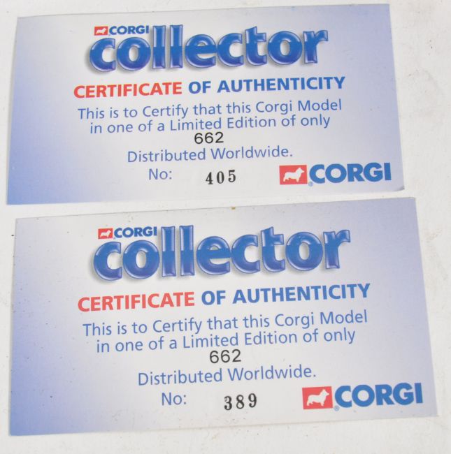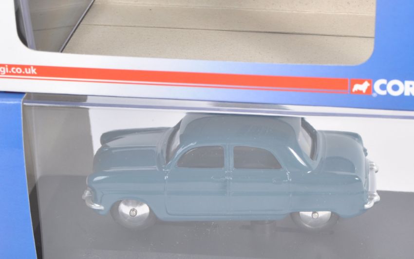 A collection of x3 Corgi diecast Ford Consul saloon model cars made exclusively for the Corgi Collector members. Two accompanying Certificates of Authenticity included for numbers 389 and 405 of only 662 ever made. All models are mint and within original boxes and display cases.