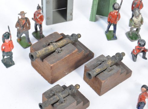 A good collection of assorted vintage Britains made lead soldiers - all Grenadier Guards / Scots Guards (or similar). Some believed pre-war examples present. Also includes mounted cannons, sentry boxes etc. Most figures marked ' Britains ' to underside. Great collection.