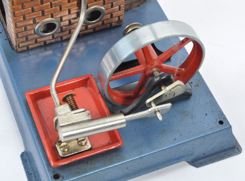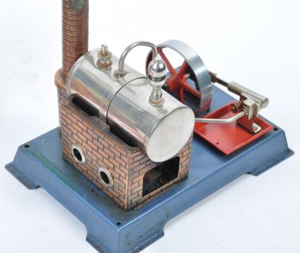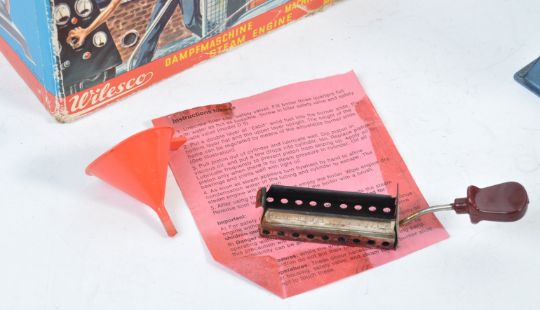 An original vintage Wilesco made ' D5 ' live steam engine. Boiler, flywheel and piston arrangement mounted on a blue metal base. Complete with chimney, solid fuel burner and red plastic funnel. Within its original box. Appears little used. Great live steam plant.