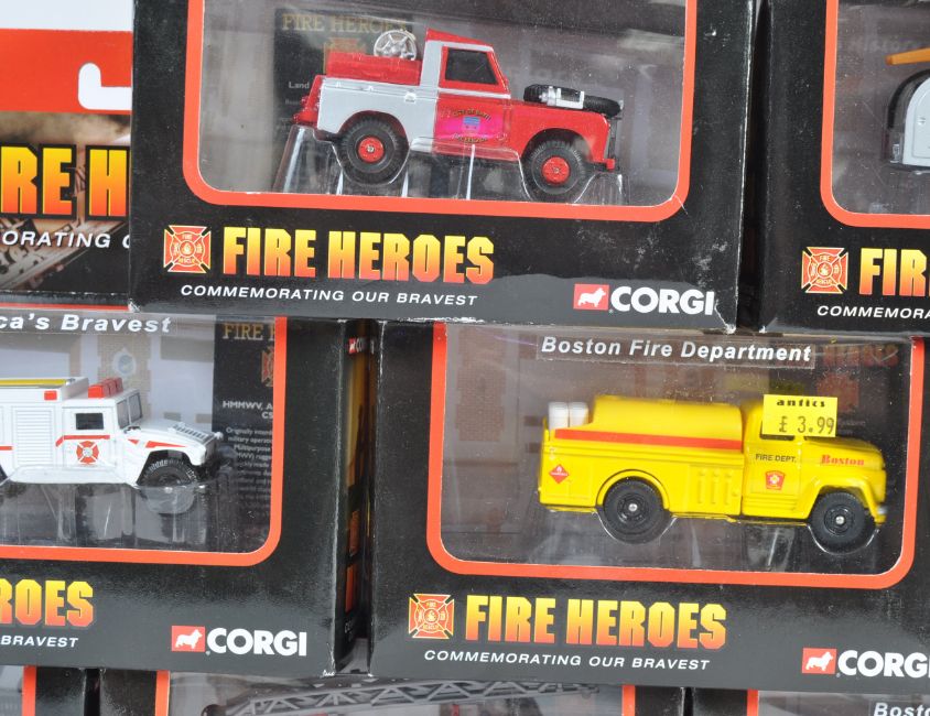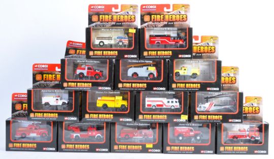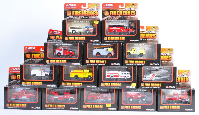 A collection of x14 Corgi Toy made Diecast ' Fire Heroes ' model vehicles. Including authentic replicas from the Boston Fire Department, Texas Forest Fire Rescue, Washington DC Fire department. Various vehicles such as helicopter, water tankers and pumpers. Interesting assortment.