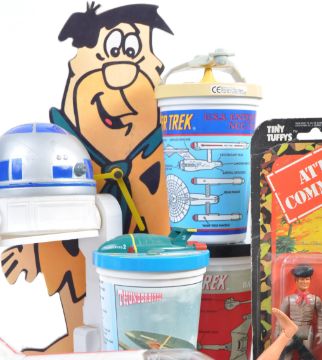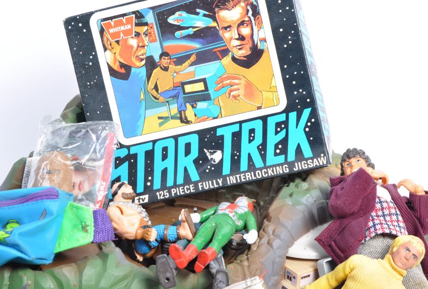 A large collection of assorted vintage TV and film related toys comprising of Denys Fisher Doctor Who, Mego Starsky and Hutch, carded Attack Commandos, Teenage Mutant Ninja Turtles, Thunderbirds Tracey Island, Star Wars, Star Trek jigsaw puzzle, The Flintstones wall clock and many more. Interesting assortment.