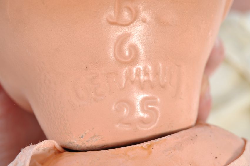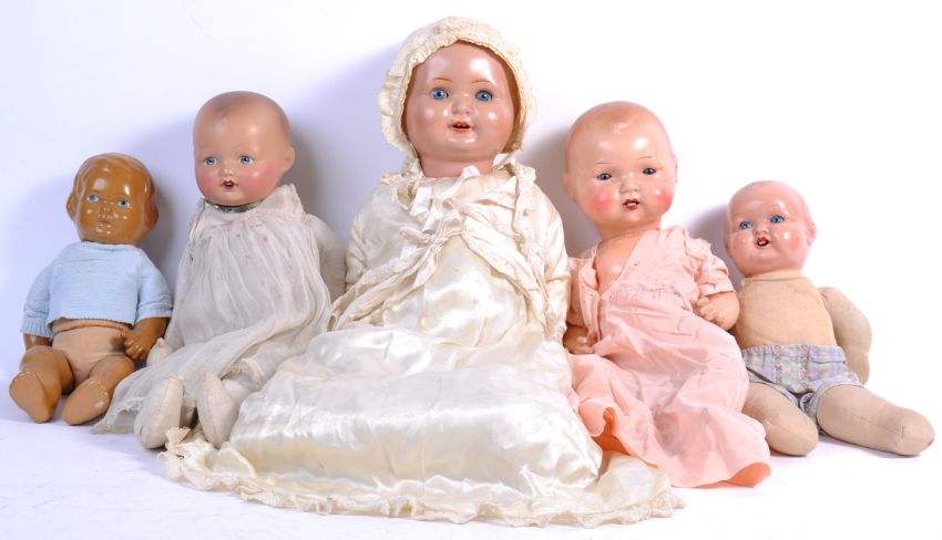 A good collection of x5 antique / vintage dolls to include; a German Jubilee doll, a German bisque headed D6-25 doll, a 1930's hard plastic crying doll, a vintage English Astex doll, and a vintage composition open mouthed doll. All with outfits, some with flirty eyes. Tallest approx; 56cm.