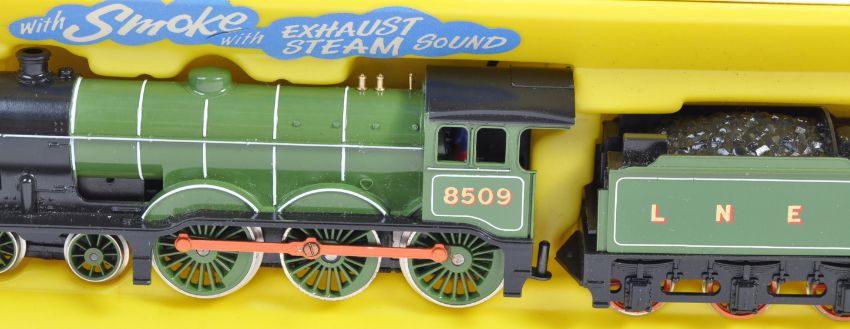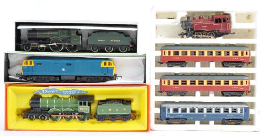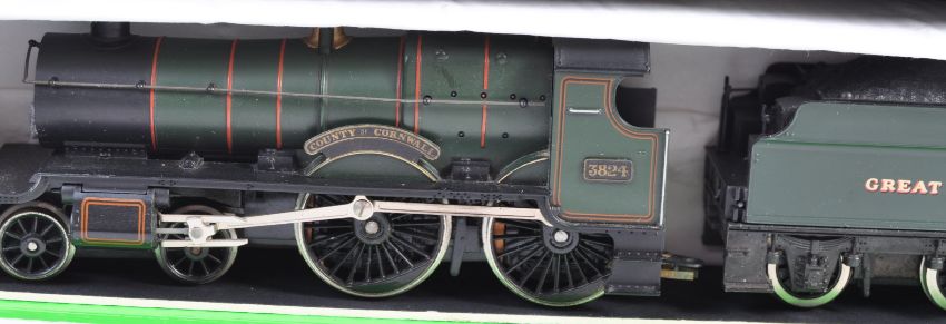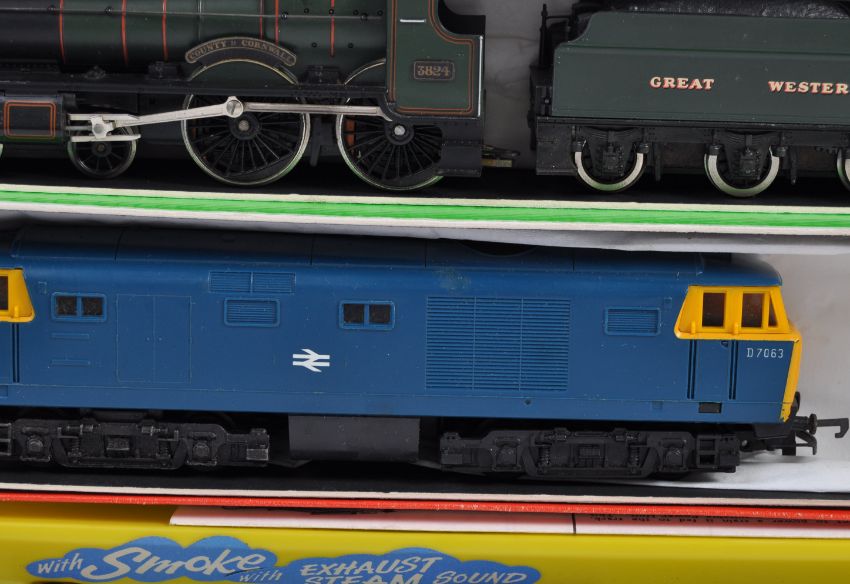 A collection of x7 unboxed Tri-ang Hornby and Lima 00 Gauge locomotives comprising Hornby R 866AS , a reconditioned Hornby 3824 ' County of Cornwall ' , a reconditioned Hornby D7063 and a collection of Lima coaches and locomotive.