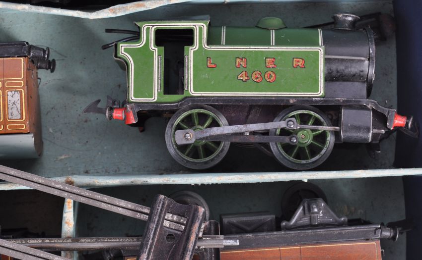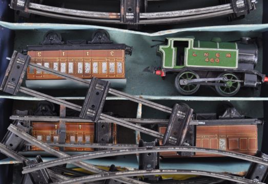 A vintage Hornby made 0 gauge model railway trainset set 40020 ' 101 Tank Passenger Set '. Appears complete (but is unchecked) with the LNER 460 green locomotive (clockwork). Within its original box (tatty). Charming set.