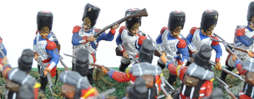 An impressive collection of 1/32 scale Napoleonic War plastic figures - ' British Infantry ' and ' British and French Battle '  - comprising of x63 pro-painted highly detailed model figures mounted on dioramic base plates. x2 groups and x4 individual free standing figures total. Make unknown but probably Drum and Flag, Airfix or similar. An impressive museum quality collection.