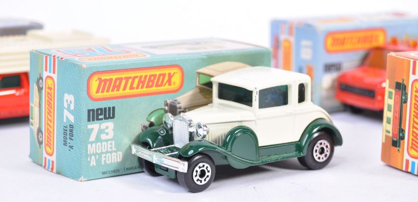 A collection of 5x original vintage 1970's Matchbox Superfast / 1-75 Series boxed diecast models comprising of numbers 54 - Mobile Home, 61 - Wreck Truck, 44 - Passenger Coach, 38 - Camper and 73 - A Ford. All packaged in original boxes. Contents appear mint to near mint. Great collection.