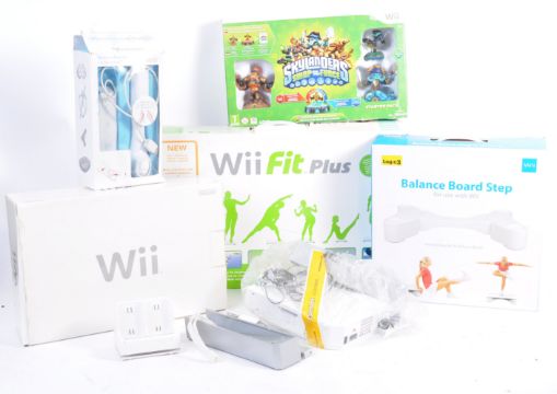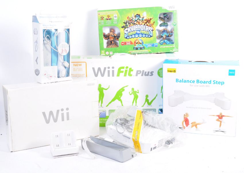 A collection of Nintendo made Wii games consoles and related accessories. To include; an unboxed console, a boxed console, a Wii Fit Plus (boxed), several boxed accessories and other items. Great collection.