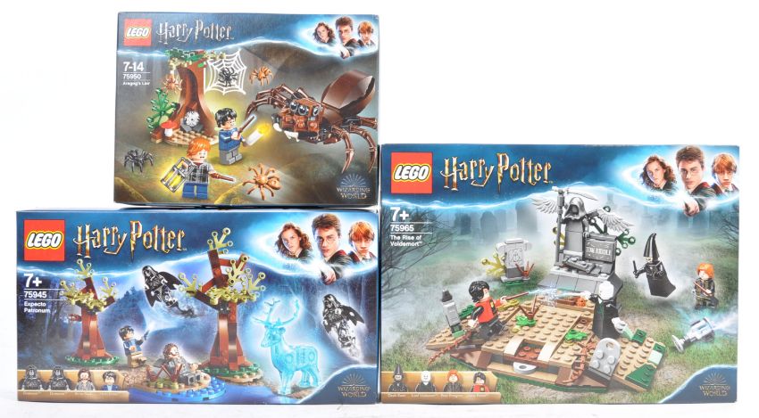 A collection of x3 Lego sets - Harry Potter - 75945 / 75965 / 75950  - Original Lego Harry Potter factory sealed boxed sets No 75945 / 75965 / 75950 ' Expecto Patronum ', 'The Rise Of Voldemort ' , ' Aragog's Lair '  Highly detailed sets with minifigures. Great sets.