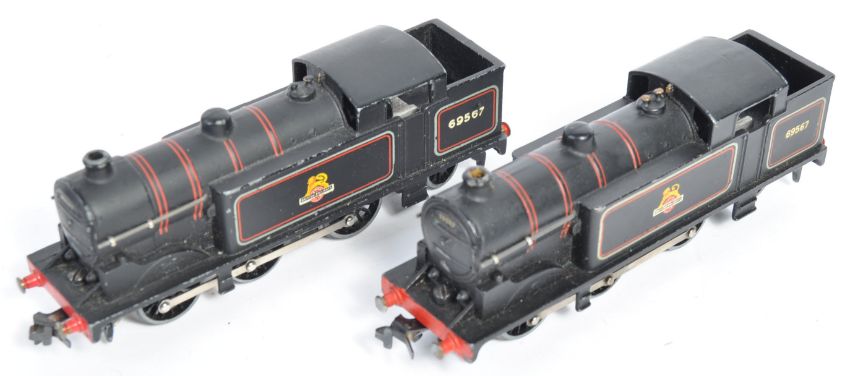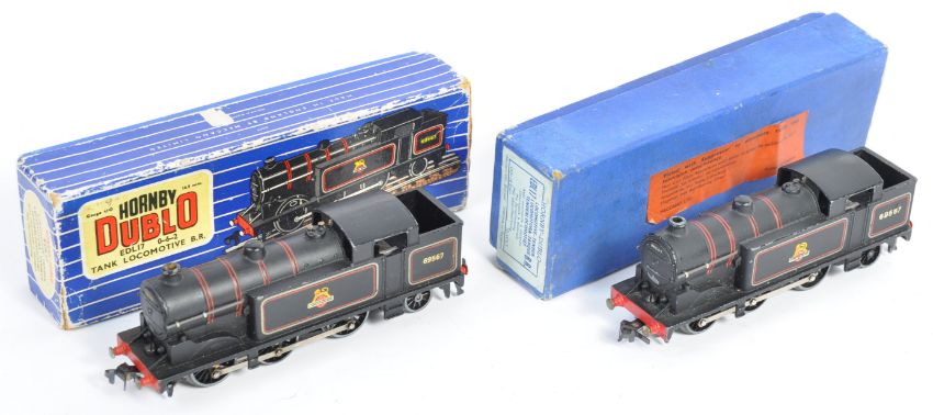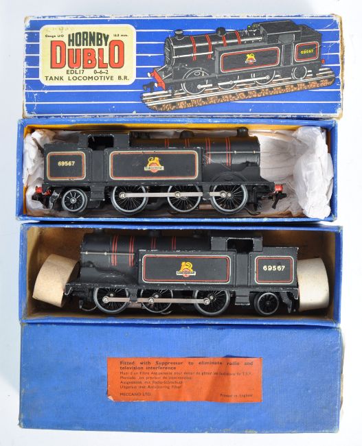 Two original vintage Hornby Dublo 00 gauge model railway electric train set locomotives EDL17 0-6-2 Tank Locomotive BR British Rail black livery. In variant boxes including a full colour card example and a plain blue example with original red label. Good examples.