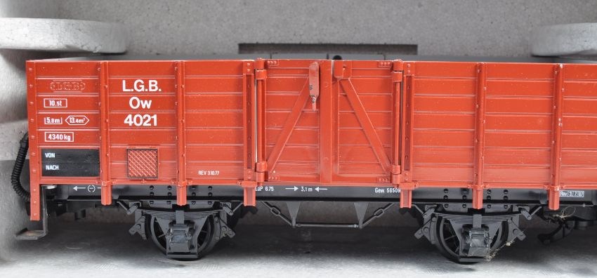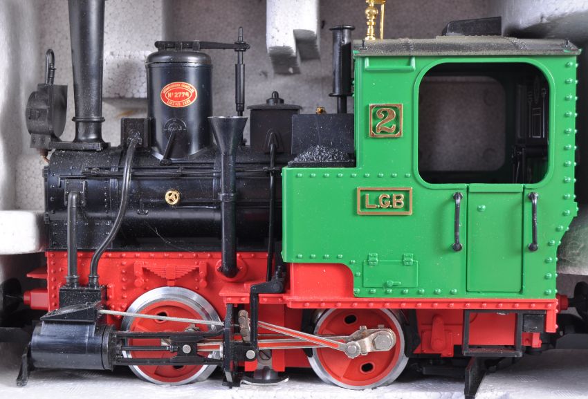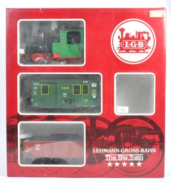 An original LGB Lehmann G Scale model railway trainset locomotive set No. 20401 - ' Goods Train Set '. Incredibly well detailed locomotive with green cab and red chassis with both wagons present and four figures. Lacking track but within a good original box.