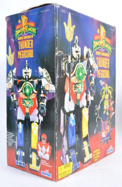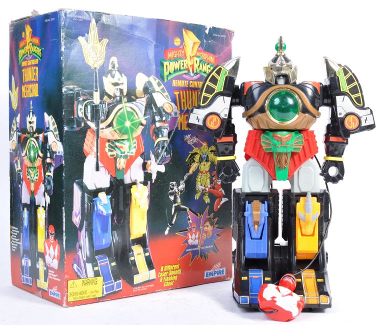 A rare vintage 1990's Empire made Mighty Morphin' Power Rangers ' Remote Controlled Thunder Megazord ' action figure. Appears complete, housed within its original pictorial box. With wired remote. Working order. Rare Power Rangers toy.