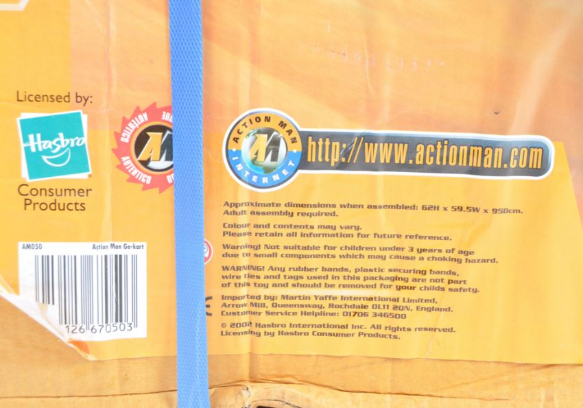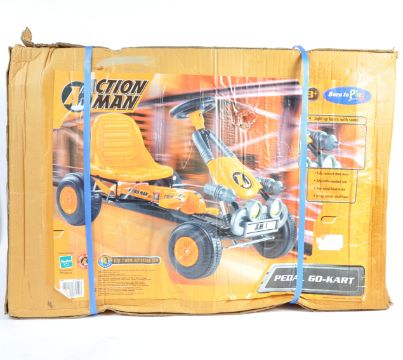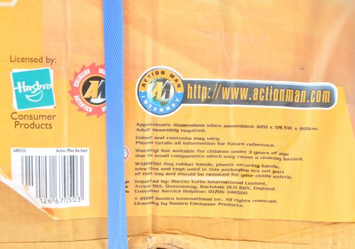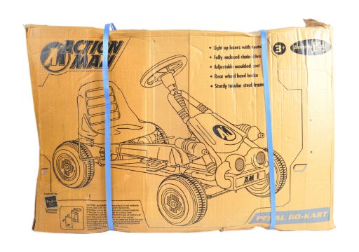 An incredibly rare Born To Play made Hasbro licensed ' Action Man Pedal Go Kart '. Believed to be one of either a very limited run OR a pre-production finished item. Very little is known about these Go Carts, and they do not appear in any directories. This Go-Kart comes factory sealed within its original box (a little tatty), and still retains its original strapping. Rare and unusual piece of Action Man memorabilia.