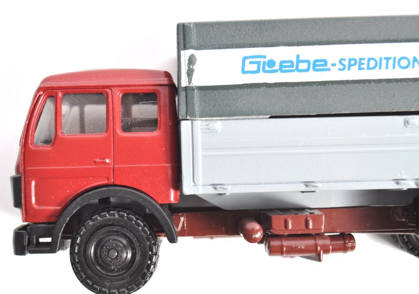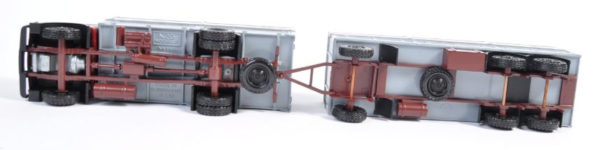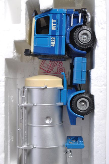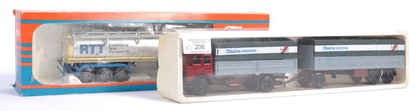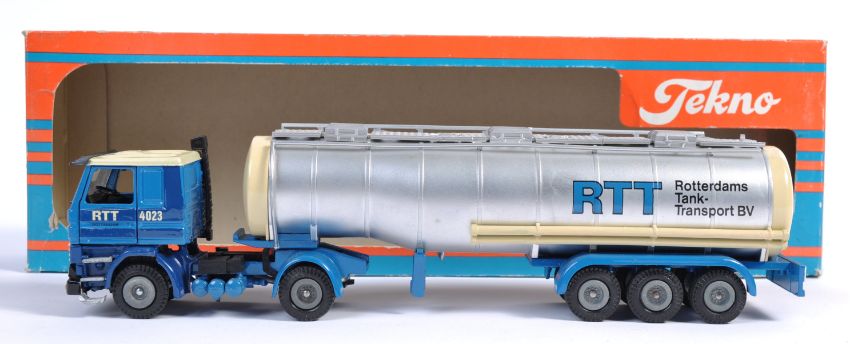 Two original vintage diecast haulage and transportation related vehicle models. Comprises of 1x Tekno Scania RTT Tank Transporter 1/50 precision scale and 1x Glebe NZG Mercedes cab and two sheeted trailer loads 1/50 scale. Both within original boxes.