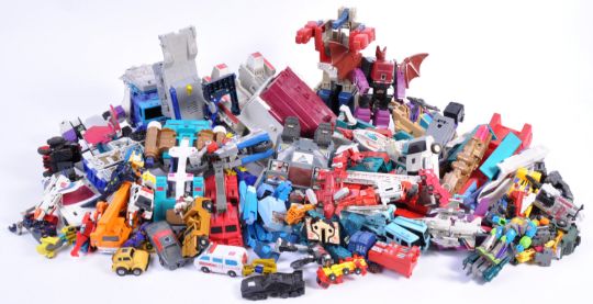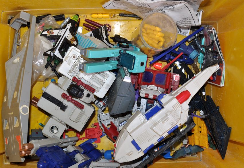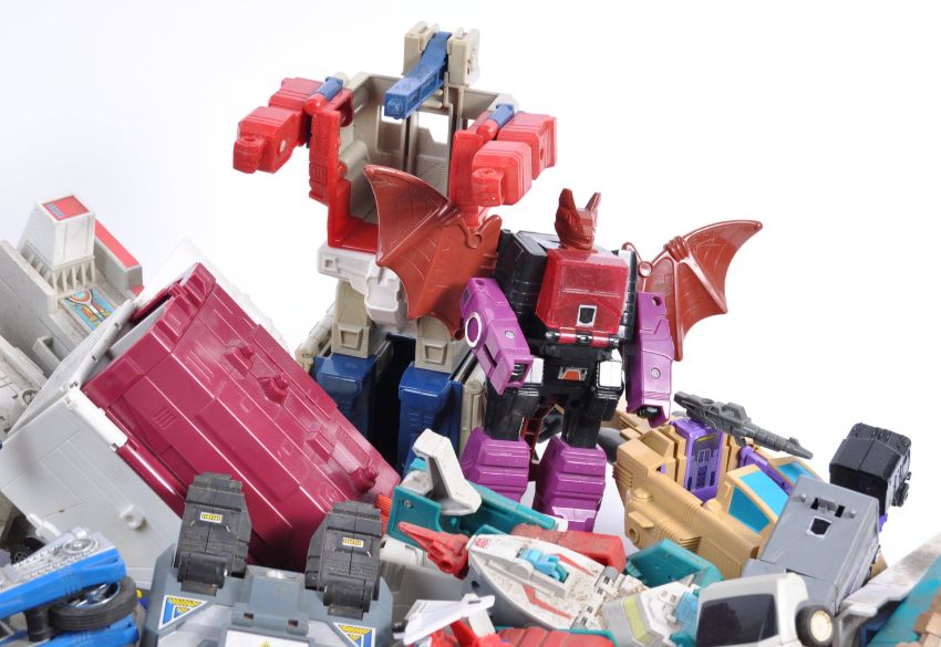A collection of original vintage 1980's Hasbro made Transformers to include Star Scream, Battlecharger Runamuck, Bruticus, Throttlebot Goldbug, Hot Spot, Autobot Grapple, Mindwipe Headmaster and others. Mostly small transformers, some instructions and packaging present. Interesting assortment.