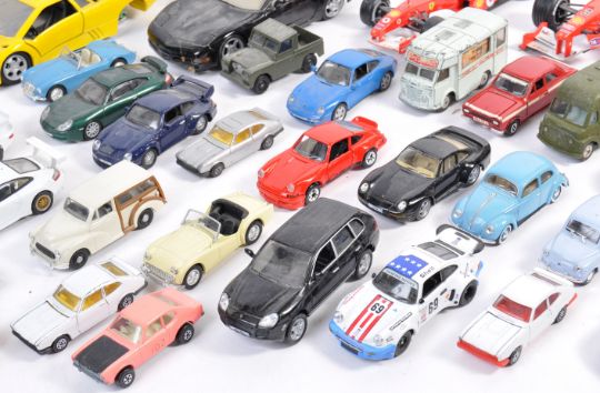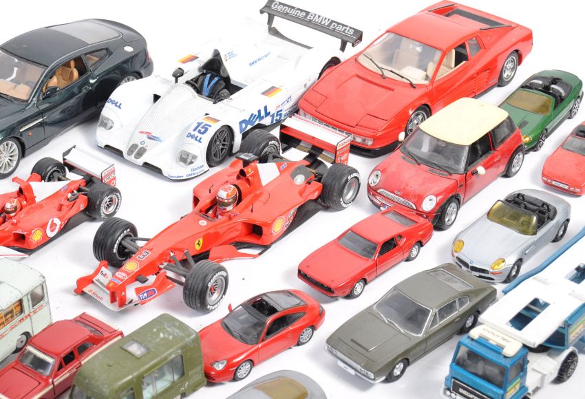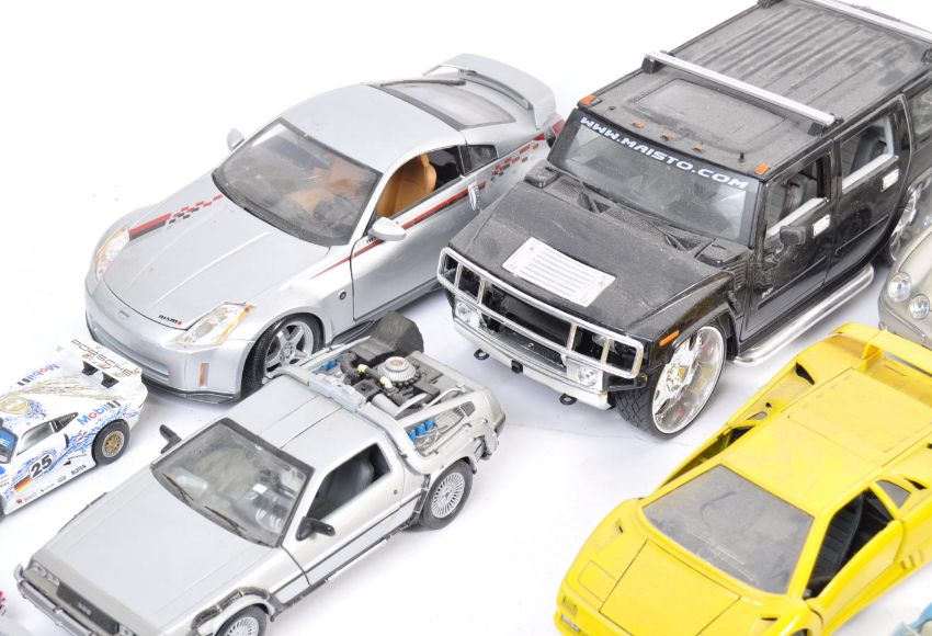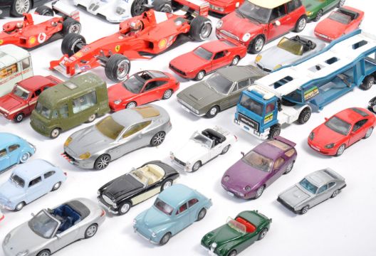 A collection of assorted diecast model cars, of various makes, to include; Corgi, Solido, DeAgostini and Maisto. Various scales present to include 1/43, 1/24 and 1/18. Includes; vintage Dinky Toys models, Corgi Toys models, Back To The Future Delorean, Formula One cars and others. Some good models present.